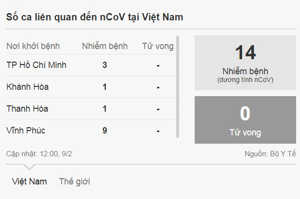 Như vậy, tổng số ca tử vong vì nCoV trên toàn cầu hiện là 910, trong đó có hai trường hợp được ghi nhận ngoài Trung Quốc đại lục là một người đàn ông Vũ Hán ở Philippines và một người đàn ông 39 tuổi ở Hong Kong. Con số này đã vượt số ca tử vong vì đại dịch SARS năm 2002-2003 là 813 người, theo số liệu của Tổ chức Y tế Thế giới (WHO).
