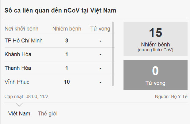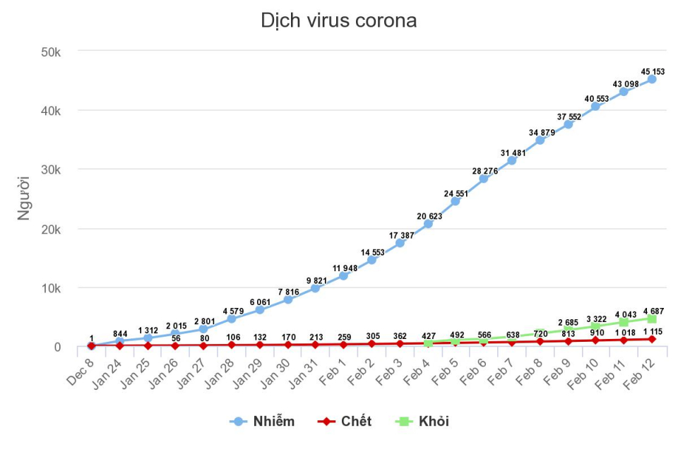 Trên toàn thế giới, 1.115 người chết vì dịch, trong đó hai trường hợp được ghi nhận ngoài Trung Quốc đại lục là một người đàn ông Vũ Hán ở Philippines và một người đàn ông ở Hong Kong. 45.153 người nhiễm, 8.242 người trong tình trạng nguy kịch và 4.687 người được chữa khỏi.