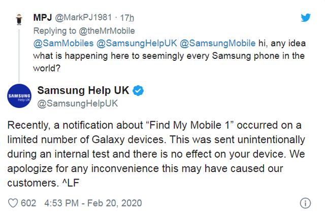 Trên trang Twitter hỗ trợ khách hàng của mình, Samsung giải thích rằng đây chỉ là một sơ suất của họ khi đang thực hiện thử nghiệm nội bộ, và vô tình tạo nên một thông báo không chủ đích, gửi đến nhiều thiết bị Samsung Galaxy trên toàn cầu.
