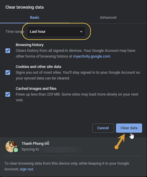 Để xóa bộ nhớ bạn bấm tổ hợp phím Ctrl+Shift+Delete, tiếp theo chọn khoảng thời gian dữ liệu được lưu trên trình duyệt và bấm Clear data.