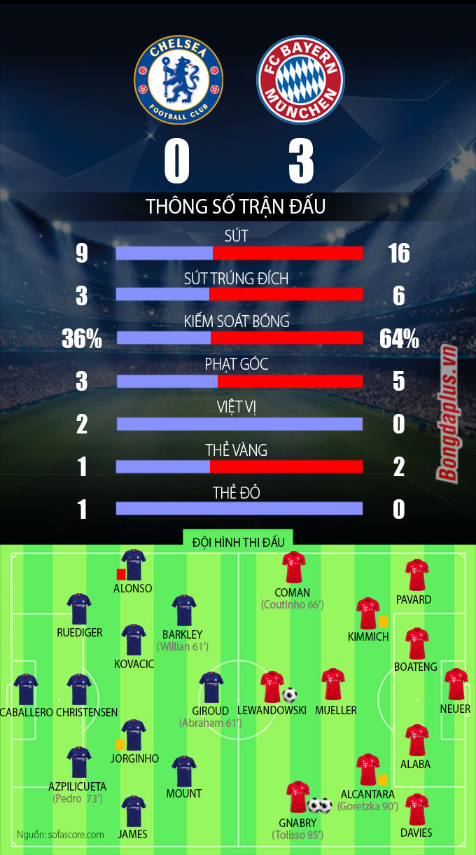 Tuy nhiên, góp công vào 2 bàn thắng liên tiếp của Bayern phải kể đến những sai lầm chết người của đội trưởng Cesar Azpilicueta. Hậu vệ người Tây Ban Nha trượt chân ngớ ngẩn trong bàn thua đầu tiên và mắc sai lầm vị trí trong bàn thua thứ 2.