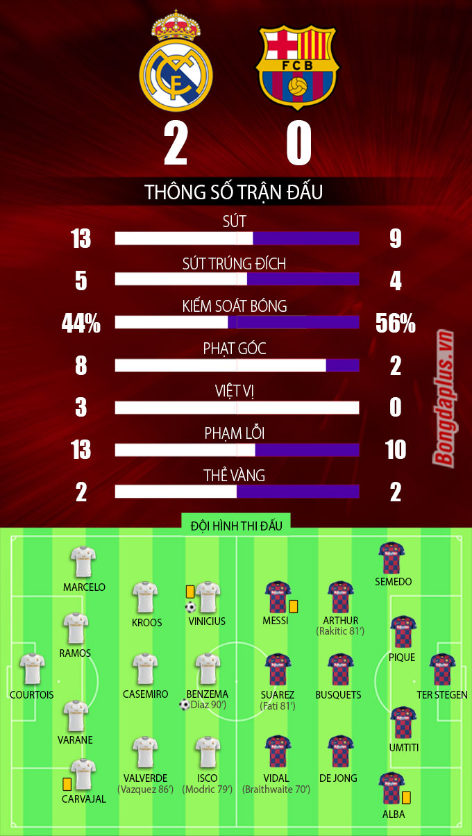 Về phần Barca, có đến một nửa trong số 6 cú dứt điểm của họ đi trúng mục tiêu. Nếu thủ môn Courtois không xuất sắc ngăn chặn Arthur và Messi trong thế đối mặt vào các phút 34 và 38 thì có lẽ Real đã phải bước vào giờ nghỉ trong thế bị dẫn bàn.