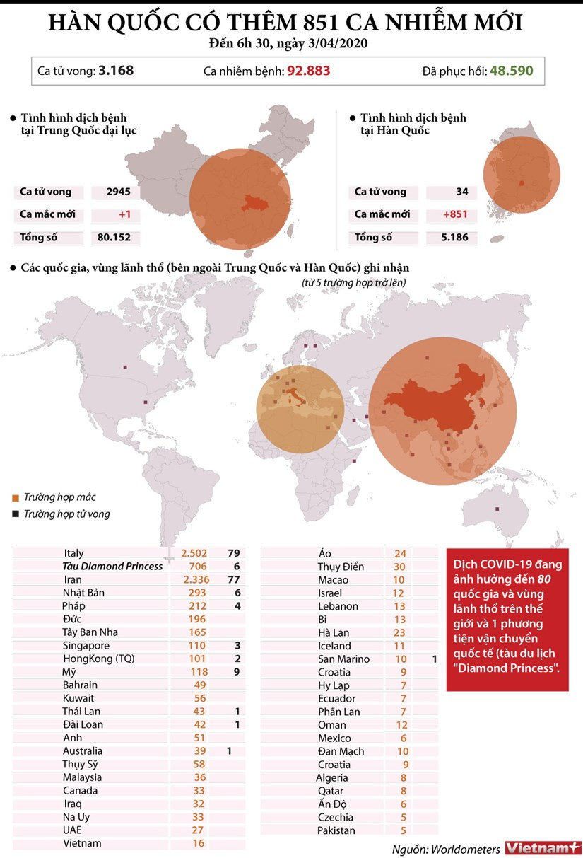 Diễn biến tình hình dịch COVID-19 đến sáng 4/3: Hàn Quốc có 851 ca mới