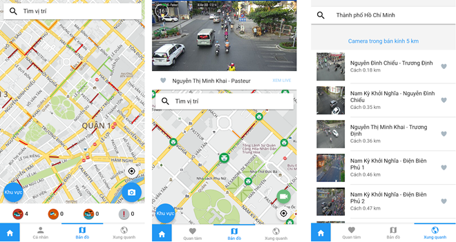 Điều thú vị là ứng dụng này còn chỉ rõ hướng bao phủ của camera ngay trên biểu tượng ở bản đồ, nó cũng có mục thống kê sẵn các camera ở gần vị trí hiện tại của bạn và mục “quan tâm” để lưu lại những camera mà bạn thường xuyên có nhu cầu tham khảo. Ngoài ra, mục này còn cho phép bạn tìm kiếm vị trí camera dựa theo 11 khu vực được gom sẵn trong mục “khu vực” để tiện tìm kiếm như khu vực đường hoa Nguyễn Huệ, cầu Phú Mỹ...