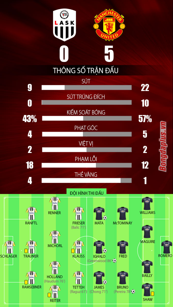 So với trận thắng Man City với tỷ số 2-0 vào cuối tuần trước, HLV Ole Gunnar Solskjaer của M.U có 5 sự thay đổi ở đội hình xuất phát. Cụ thể, Sergio Romero,Eric Bailly, Scott McTominay, Juan Mata và Odion Ighalo đá chính thay David de Gea, Aaron Wan-Bissaka, Victor Lindelof, Nemanja Matic và Anthony Martial. Dù thế, M.U vẫn là quá mạnh so với LASK.