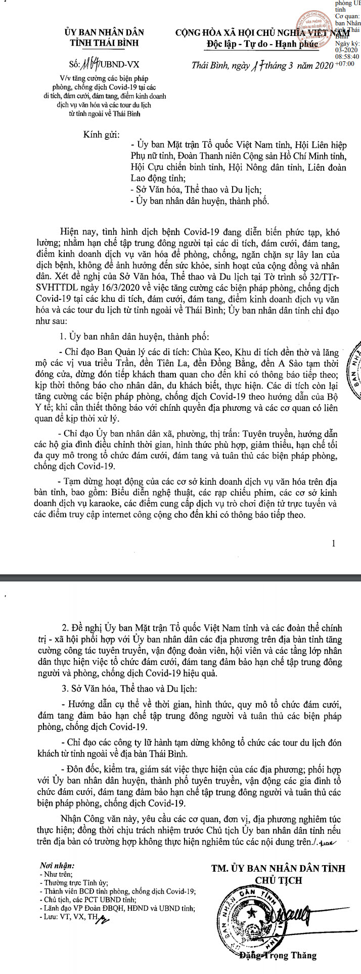 Ngày 17/3/2020, Ủy ban nhân dân tỉnh Thái Bình ban hành Công văn số 1164/UBND-VX về việc tăng cường các biện pháp phòng, chống dịch Covid-19 tại các di tích, đám cưới, đám tang, điểm kinh doanh dịch vụ văn hóa và các tour du lịch từ tỉnh ngoài về Thái Bình.