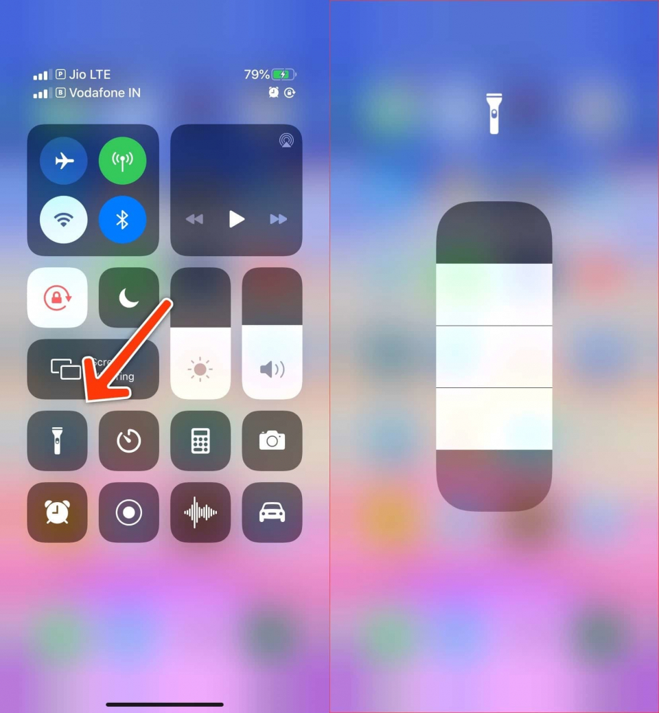 Kế đến, bạn bấm lên nút Flashlight hình chiếc đèn pin để bật đèn pin. Bạn thậm chí có thể bấm và giữ lên nút này để tăng/giảm độ sáng của đèn pin.