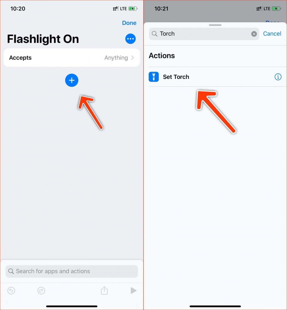 Năm 2018, Apple đã giới thiệu ứng dụng Siri Shortcuts (Phím tắt) trên iOS 12. Đây là ứng dụng tương tự dịch vụ If This Then That (IFTTT). Với Siri Shortcuts, bạn có thể tạo một shortcut (phím tắt) để bật/tắt đèn pin và đặt nó lên màn hình chính. Người dùng thậm chí còn có thể truy cập phím tắt này từ trình đơn Today View và trình đơn chia sẻ mặc định của iOS. Để tạo phím tắt, bạn làm theo các bước dưới đây: