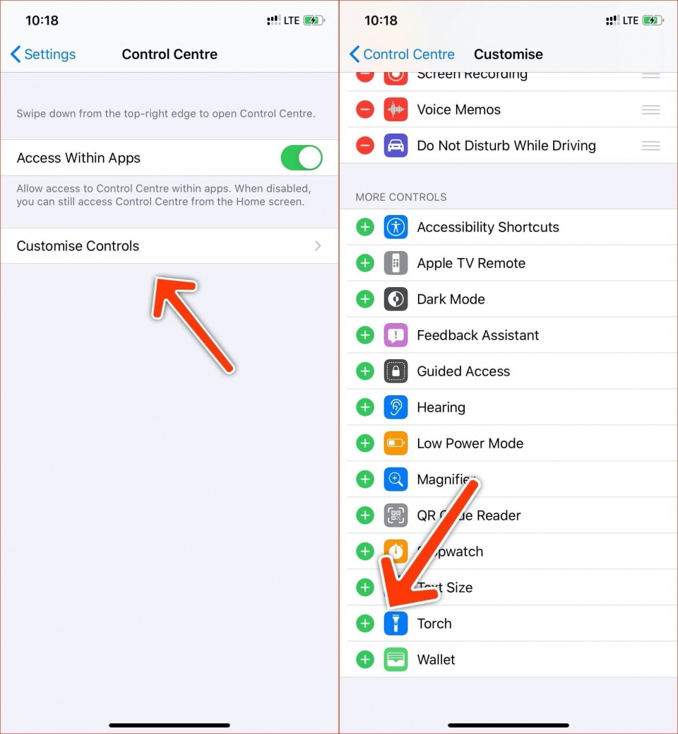 Trường hợp bạn không tìm thấy nút Flashlight trên Control Center, hoặc bạn muốn thay đổi vị trí của phím này, bạn chỉ cần mở ứng dụng Settings (Cài đặt) trên iPhone và truy cập vào trình đơn Control Center (Trung tâm điều khiển) > Customize Controls (Tùy chỉnh điều khiển). Tại đây, bạn bấm nút hình dấu cộng ở phía trước tùy chọn Torch (Đèn pin) để thêm nó vào Control Center. Sử dụng chức năng kéo và thả để điều chỉnh vị trí của nút Torch trên Control Center.