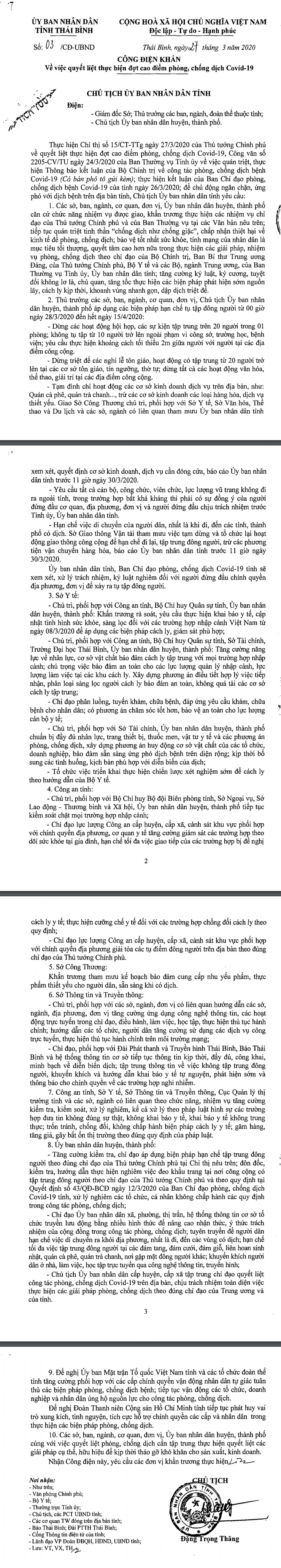 Ngày 27/3/2020, Ủy ban nhân dân tỉnh Thái Bình ban hành Công điện khẩn số 03/CĐ-UBND về việc quyết liệt thực hiện đợt cao điểm phòng, chống dịch Covid-19
